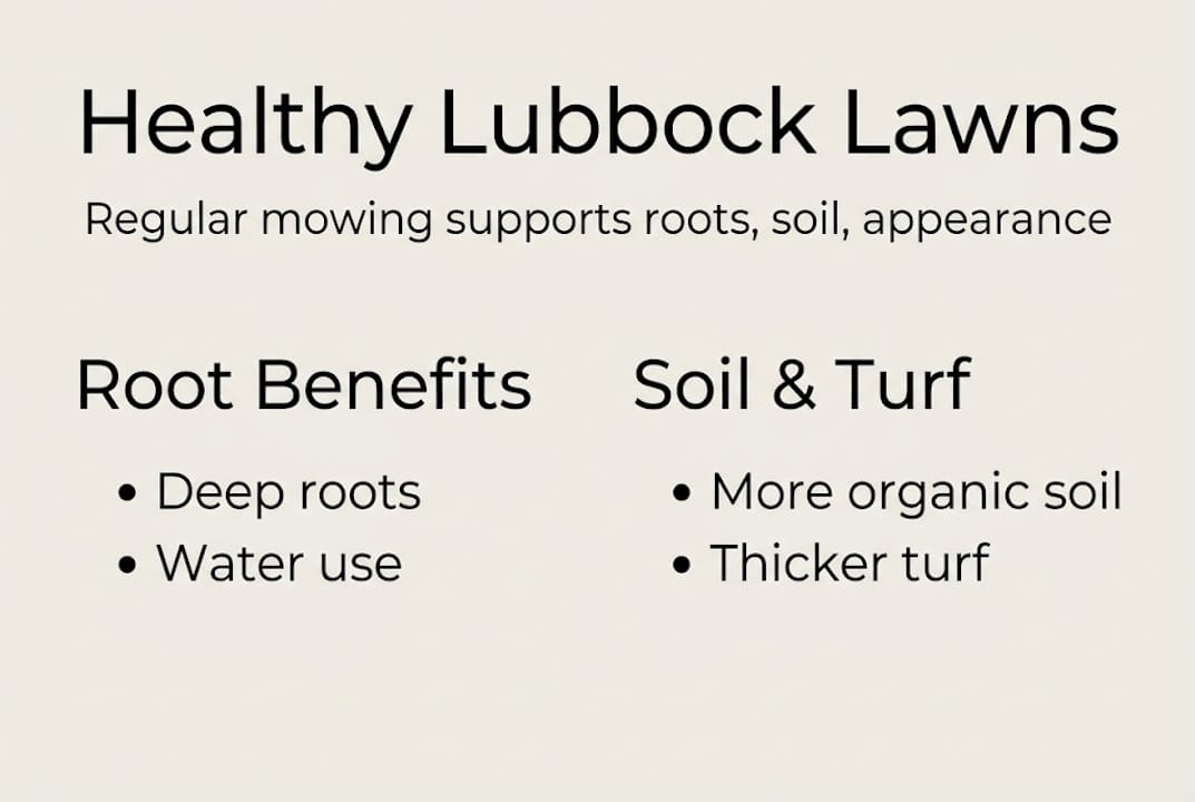 Mowing is not just about looks. What happens above the soil directly affects what happens below it. When you mow at the right height and frequency, you stimulate the grass plant to push energy downward, building a deeper, stronger root system. Deeper roots mean better access to water and nutrients, which matters a lot during Lubbock's dry summer months.