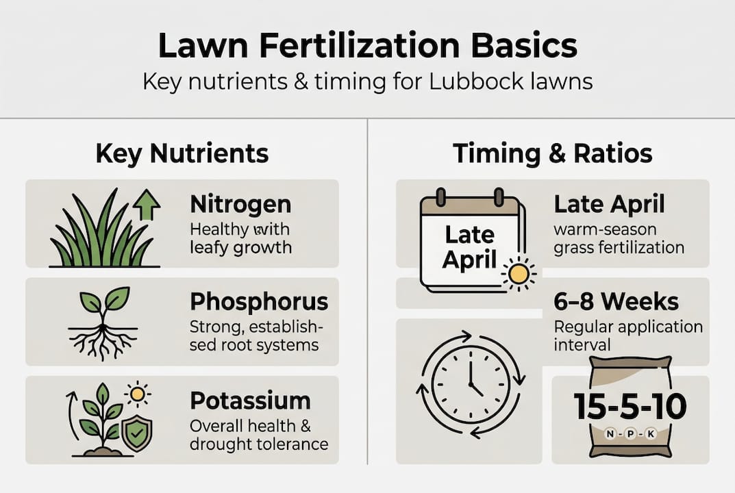 Timing separates successful fertilization from wasted effort. For Lubbock homeowners, warm-season grasses like Bermudagrass require fertilization during active growth: late April to early May start when soil temperatures exceed 65°F, then every 6-8 weeks through summer and fall, avoiding winter dormancy. Applying fertilizer before grass breaks dormancy wastes nutrients and risks runoff into storm drains. Wait until you see consistent green growth and soil temps stay reliably warm.